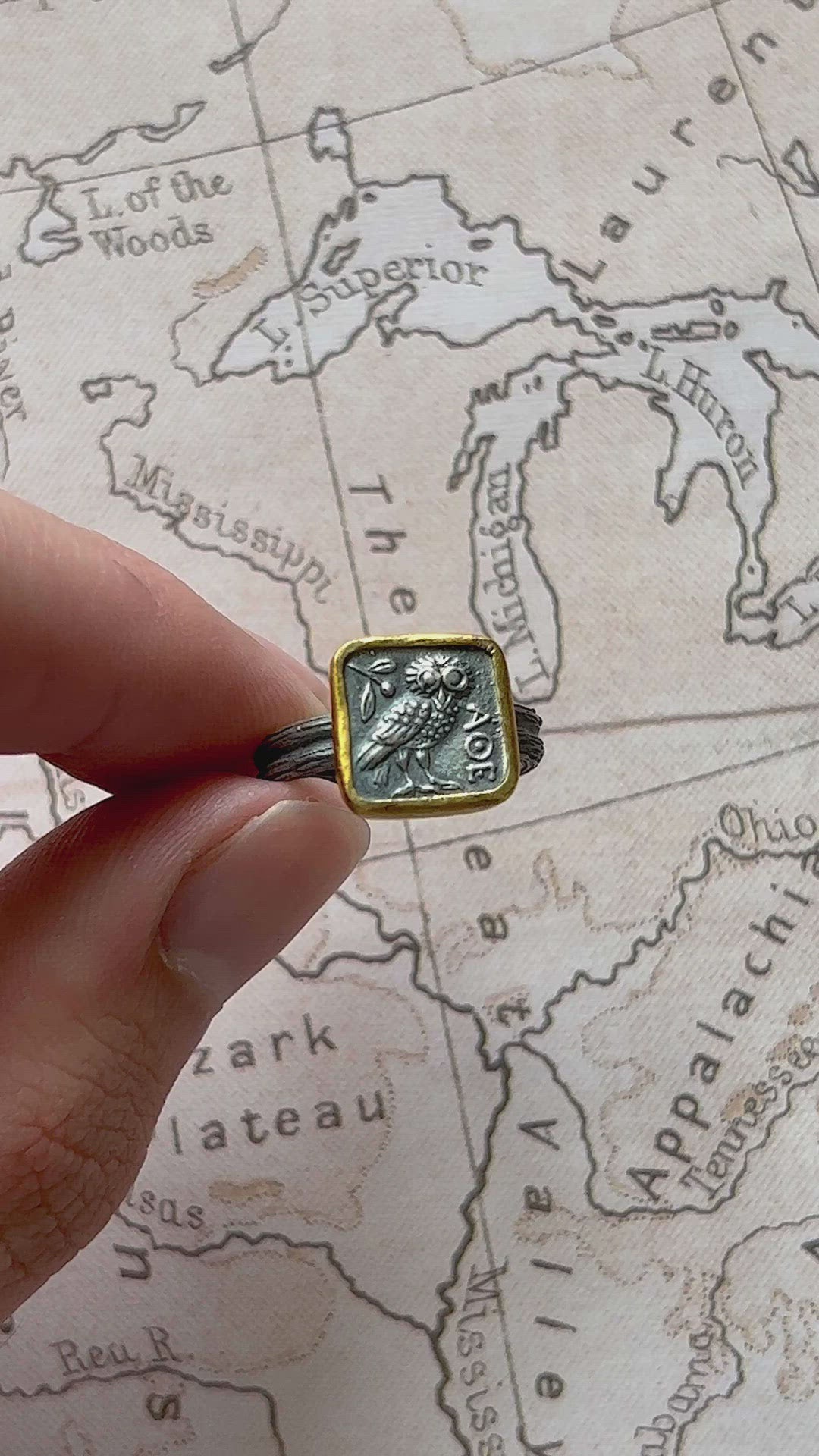 24k Gold and Silver Handmade Ring Featuring the Owl of Athena